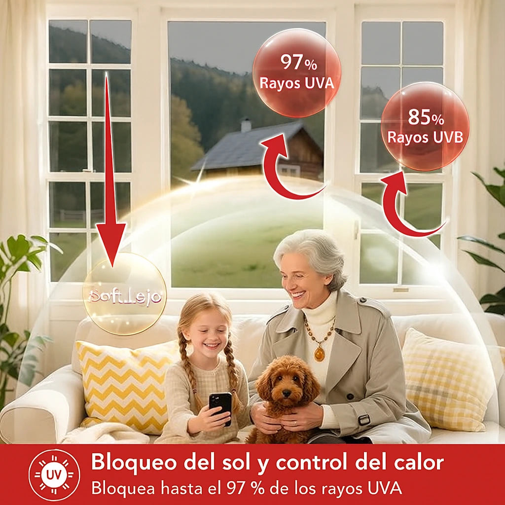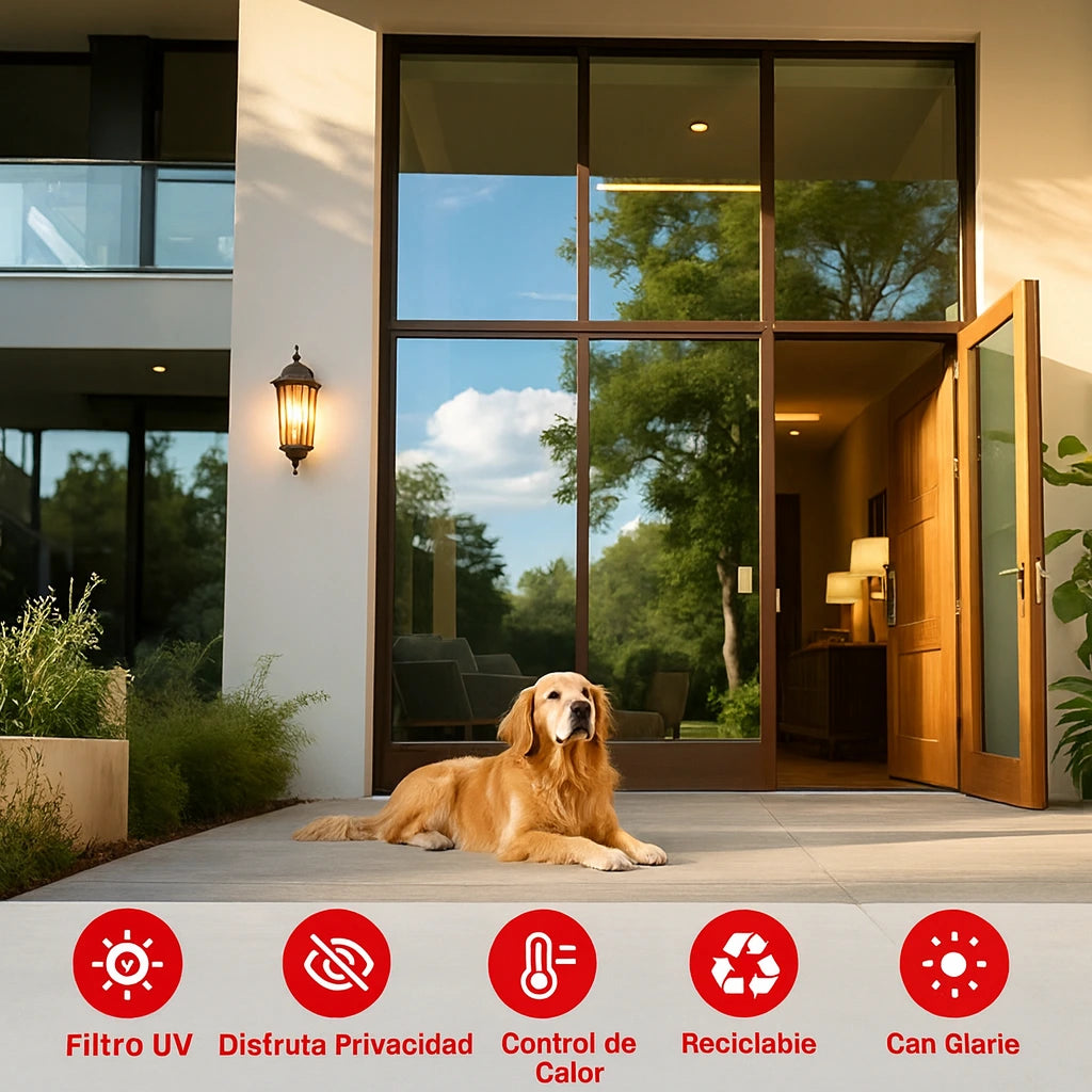 El sol no debería convertir tu hogar en un sauna. Este vinil reduce la entrada de calor y te da privacidad durante el día, manteniendo tu casa luminosa, fresca y agradable.